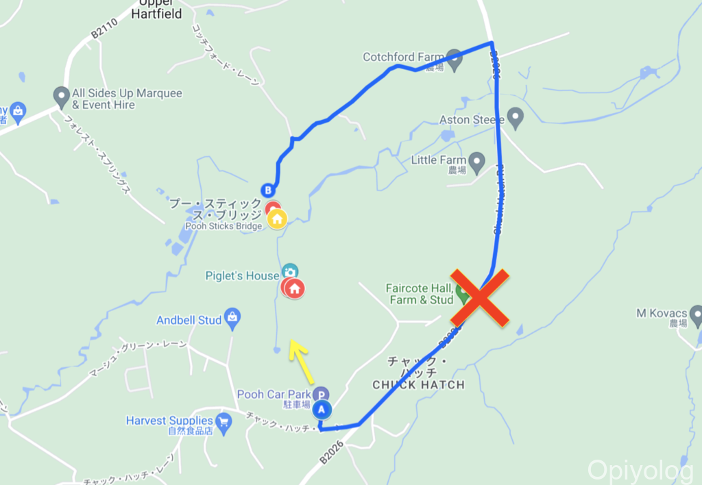 Pooh Car Parkから棒投げ橋までをGoogle mapで徒歩ルートを検索するとA→Bのルートが出てきますが、