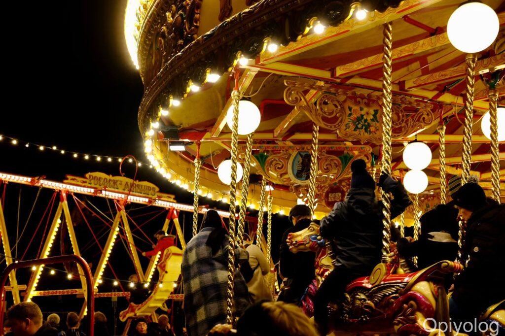 メリーゴーランドやヘルタースケルター(大型滑り台)などの乗り物がいくつかあって、小さな子供たちが遊んでいました。